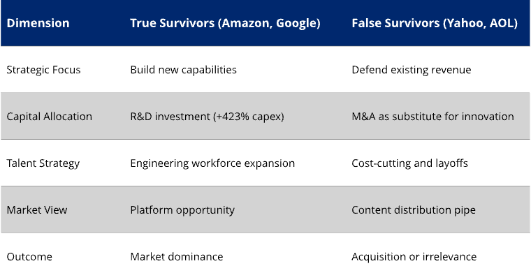 The false survivor pattern: interpreting survival as validation of the old model rather than license to build the new one. Cost-cutting disguised as strategy. M&A as substitute for innovation. Leadership focused on defending legacy revenue rather than cannibalizing it. During the quiet period of 2002-2005, Yahoo pursued search technology and advertising platforms through major acquisitions like Overture ($1.63B), while AOL contracted through layoffs and subscriber losses. In contrast, Google and Amazon invested heavily in engineering talent and infrastructure, with Google rapidly expanding its engineering workforce and Amazon increasing capital expenditures by 423%. The divergence wasn’t visible in stock prices – not yet. But it was visible in where the R&D dollars went.
